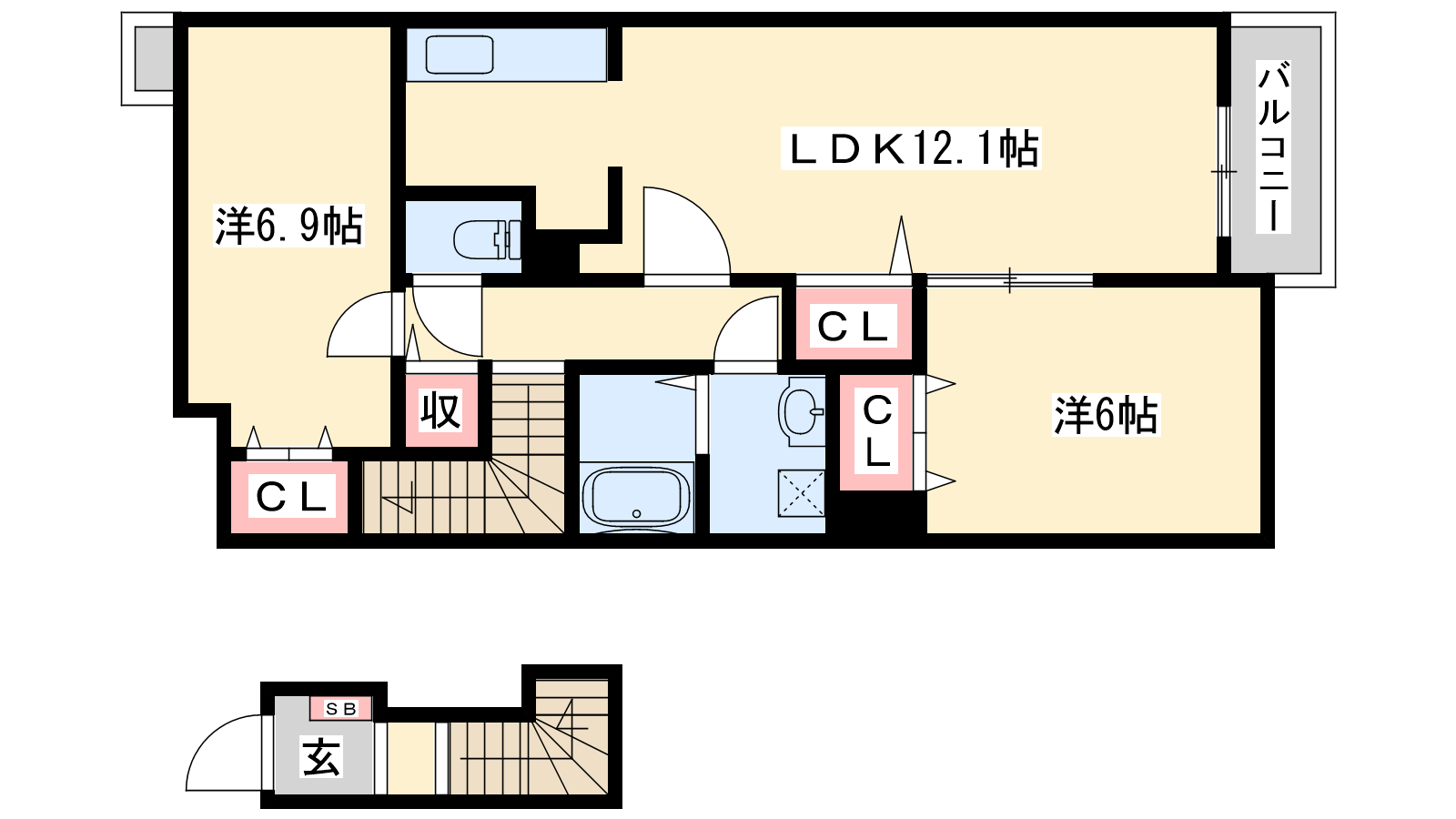 - LDK12.1帖、洋室6.9帖、洋室6帖