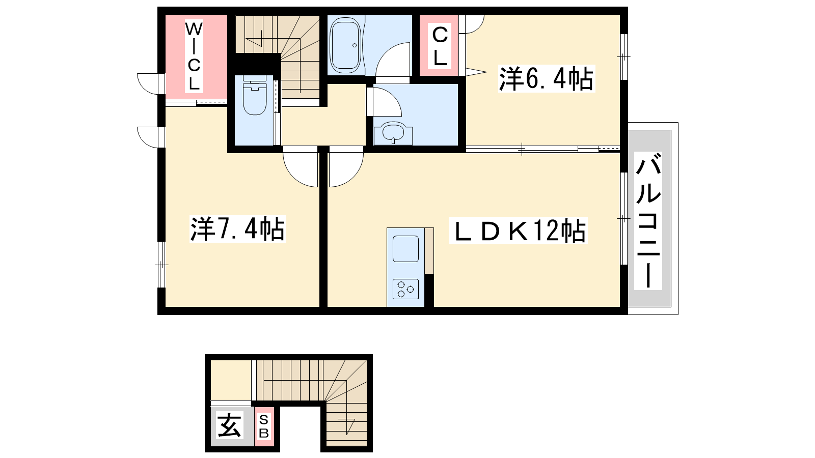 - LDK12帖、洋室7.4帖、洋室6.4帖