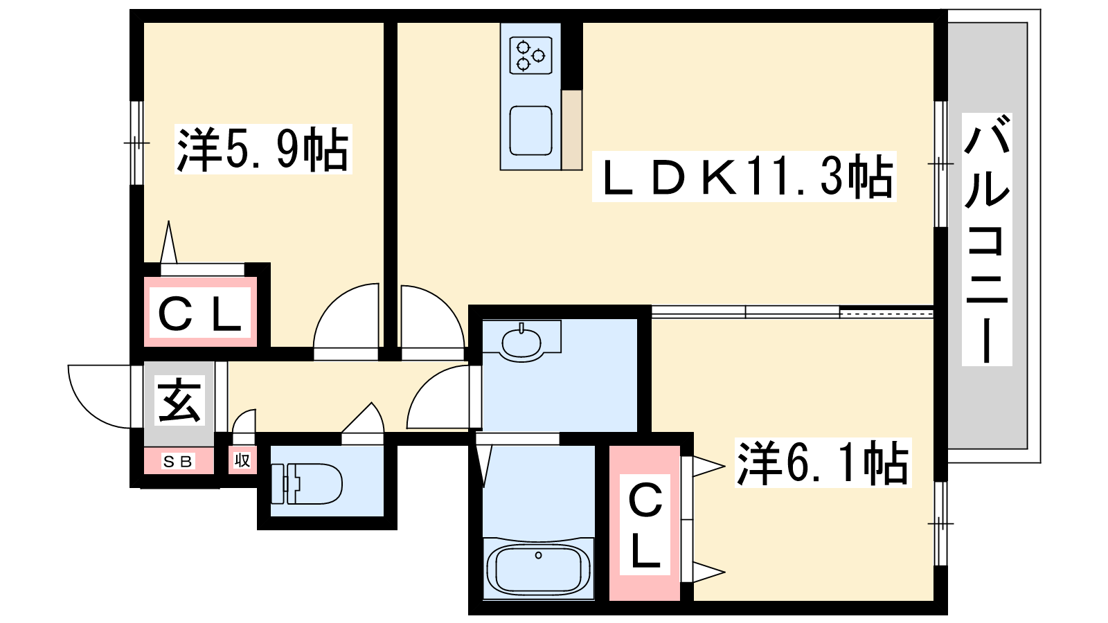 - LDK11.3帖、洋室6.1帖、洋室5.9帖