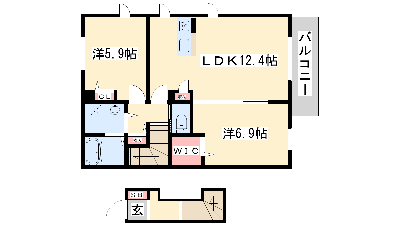 - LDK12.4帖、洋室6.9帖、洋室5.9帖
