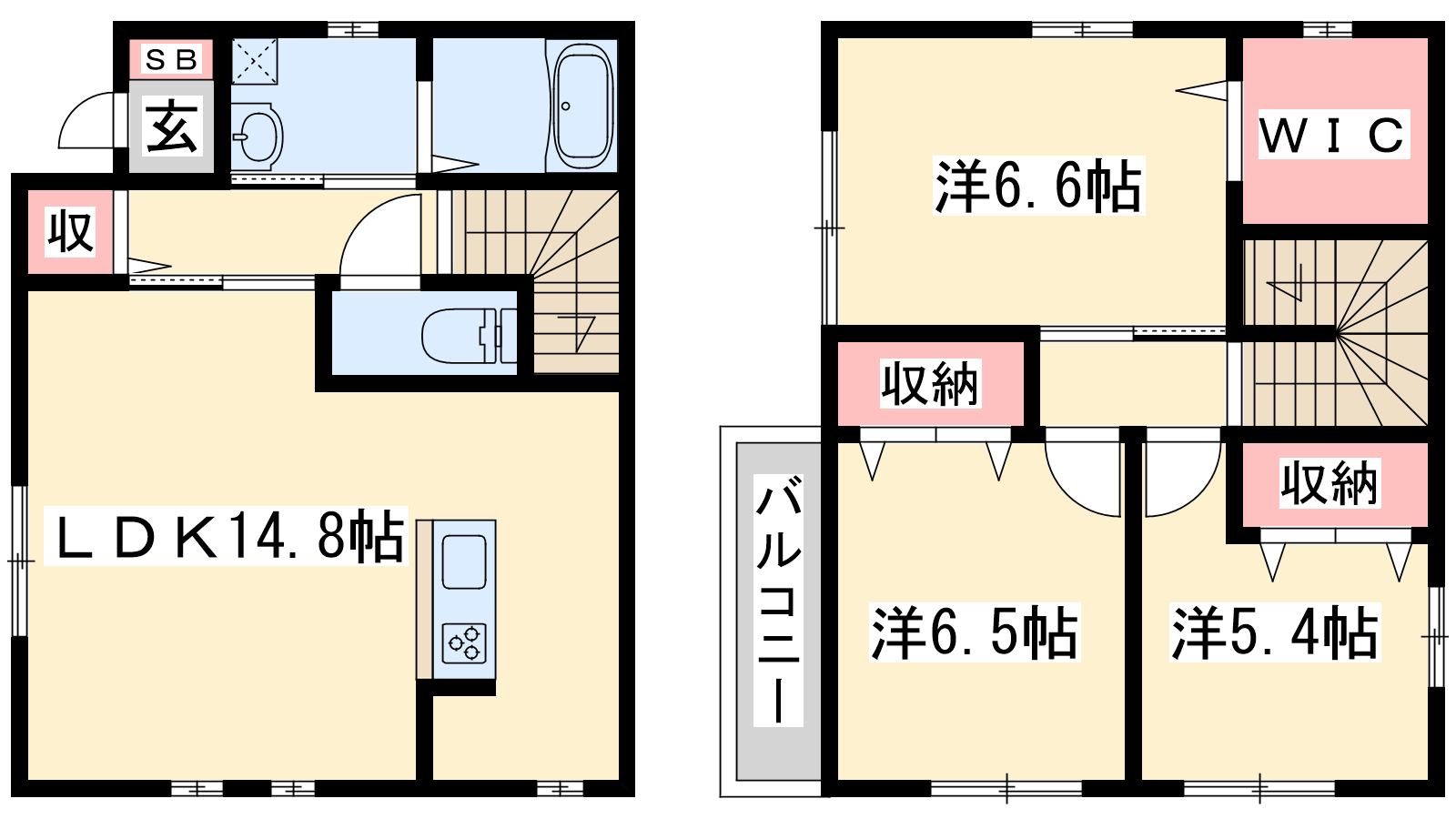 - LDK14.8帖、洋室6.6帖、洋室6.5帖、洋室5.4帖