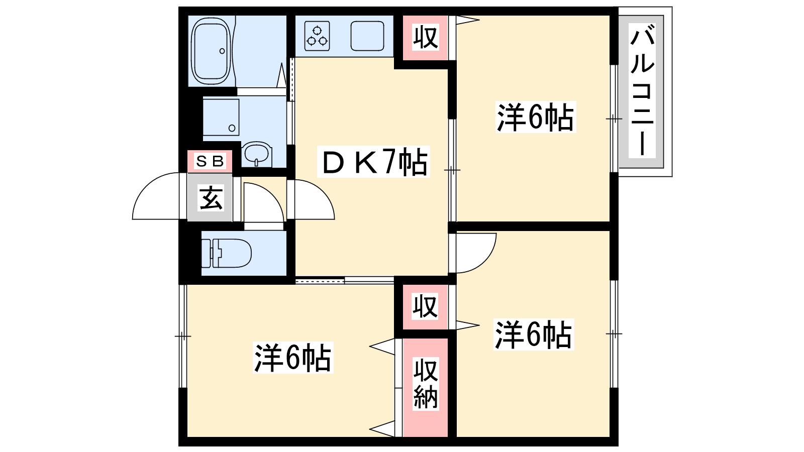 - DK7帖、洋室6帖、洋室6帖、洋室6帖