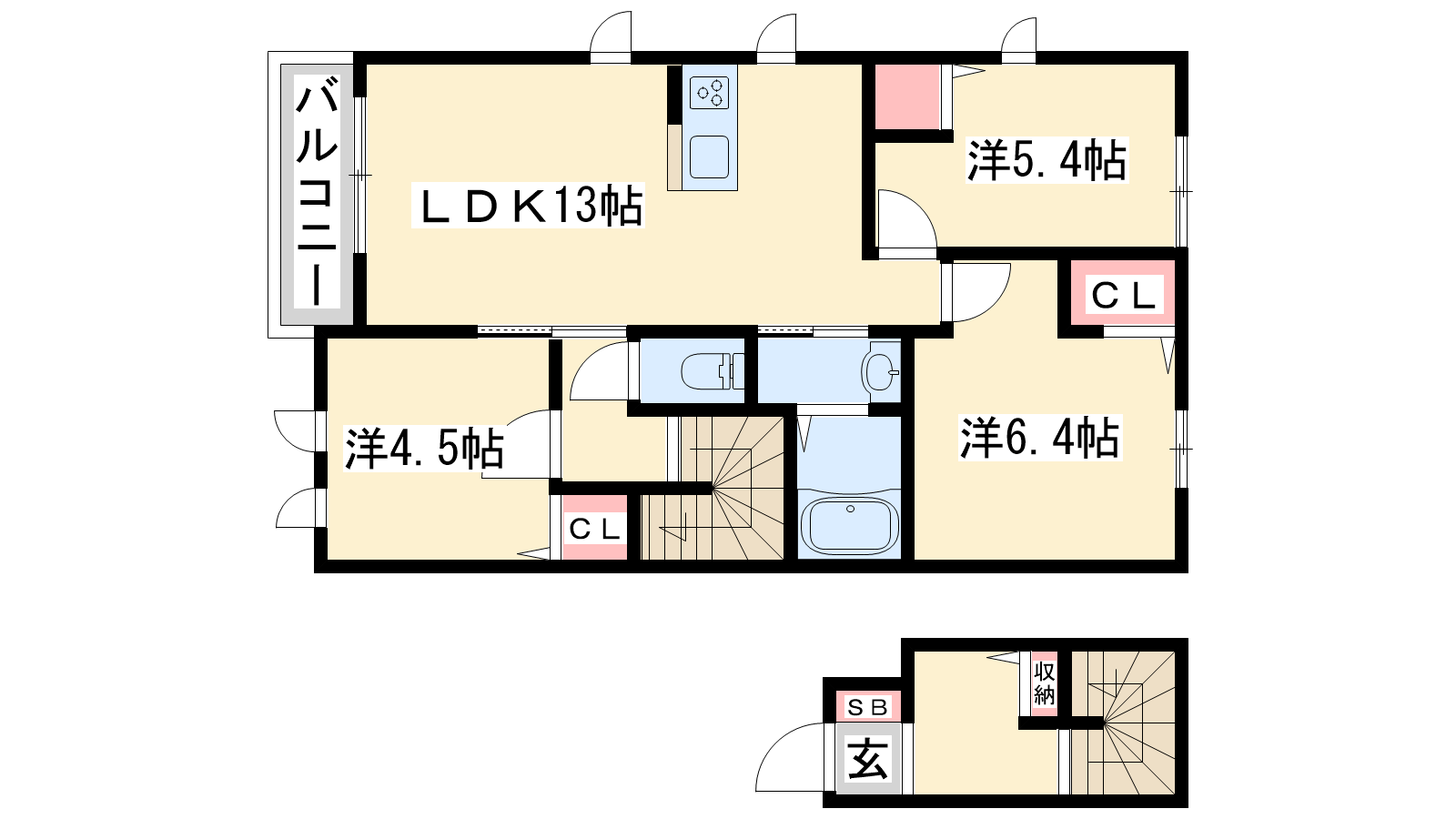 - LDK13帖、洋室6.4帖、洋室5.4帖、洋室4.5帖