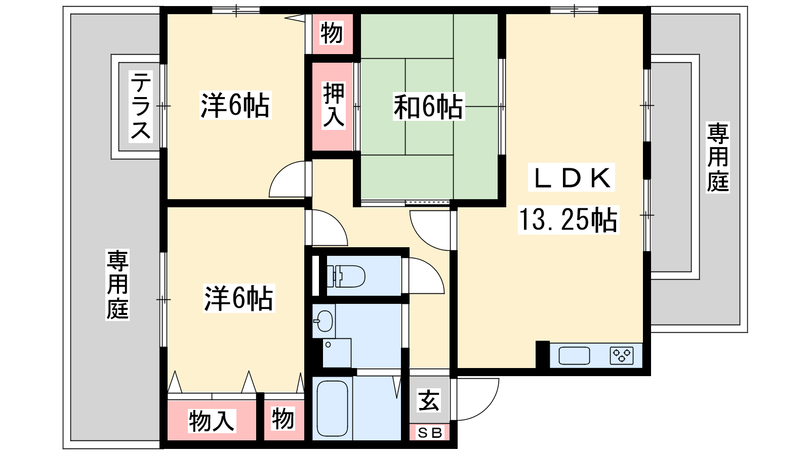 - LDK13.25帖、洋室6帖、洋室6帖、和室6帖