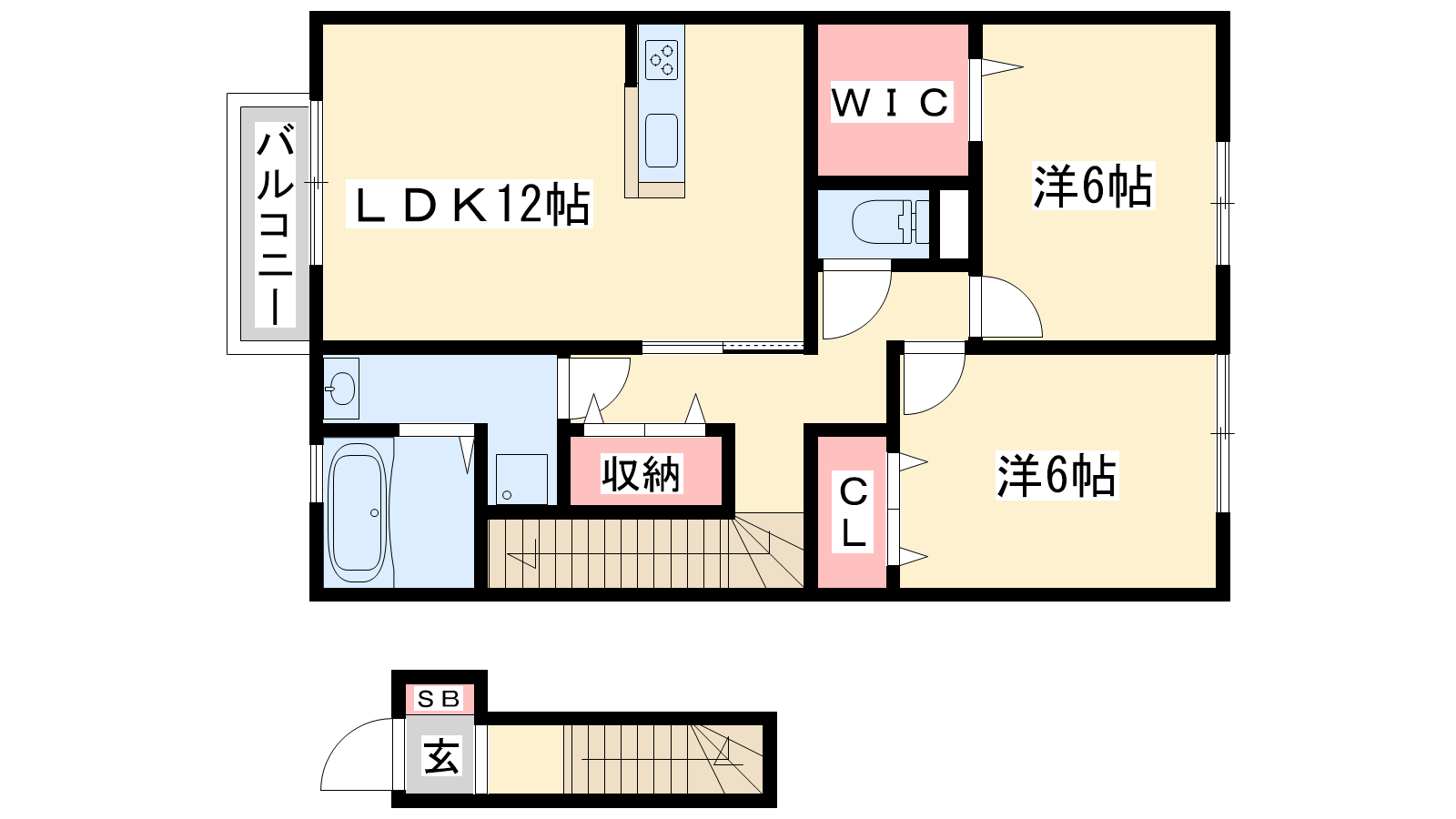 - LDK12帖、洋室6帖、洋室6帖