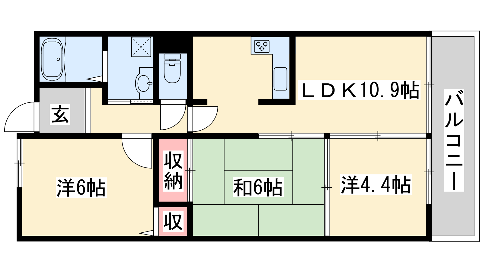 - LDK10.9帖、洋室6帖、和室6帖、洋室4.4帖