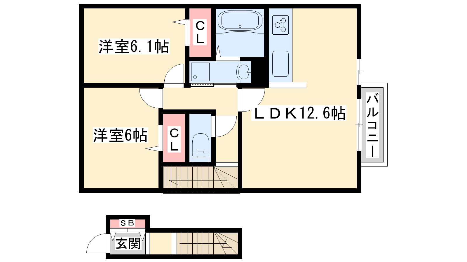 - LDK12.6帖、洋室6.1帖、洋室6帖