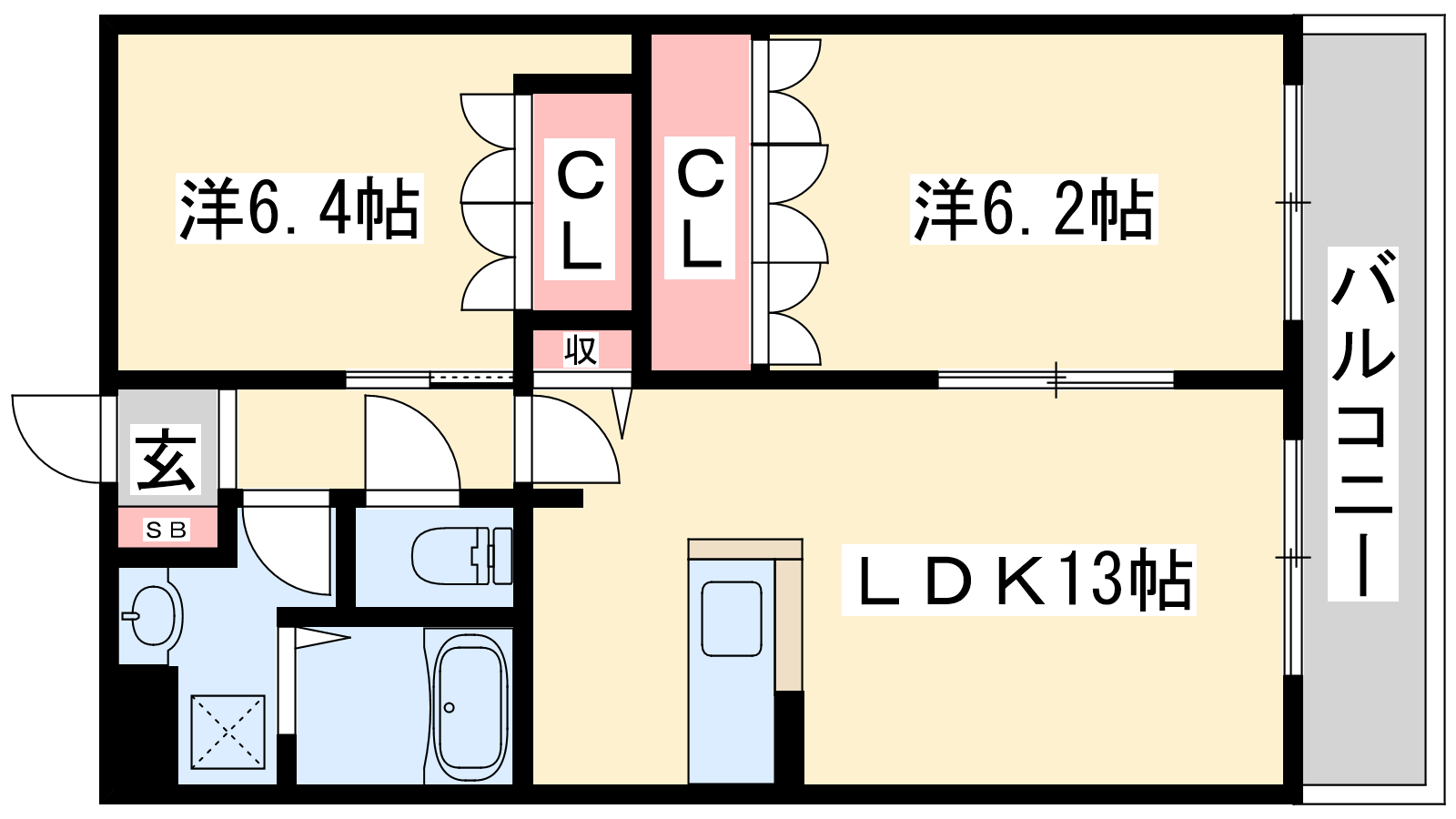 - LDK13帖、洋室6.4帖、洋室6.2帖