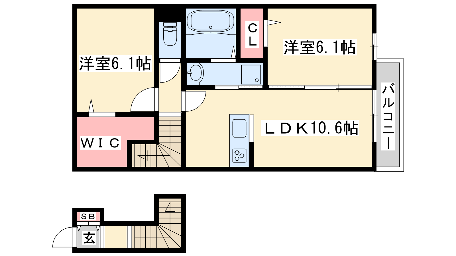- LDK10.6帖、洋室6.1帖、洋室6.1帖