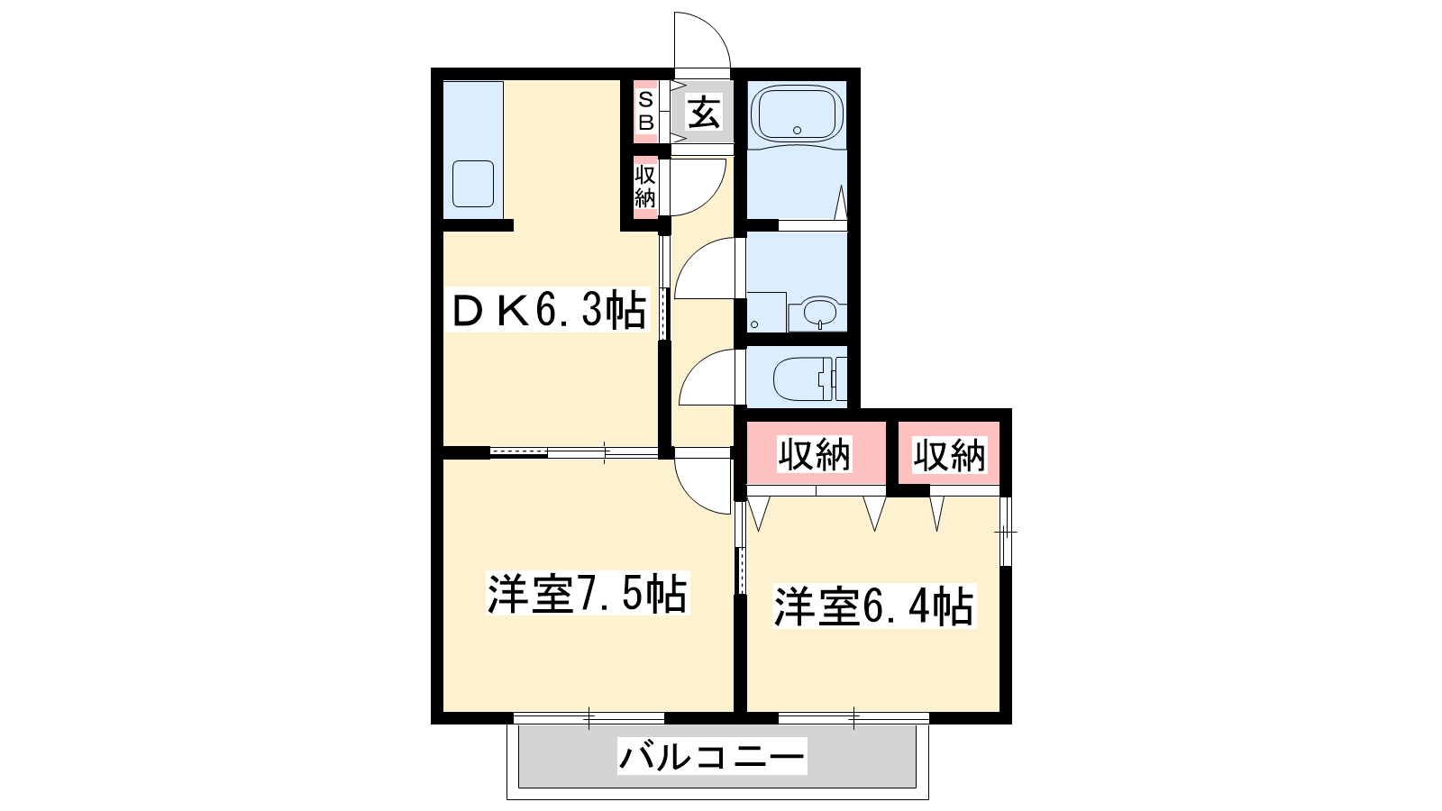 - DK6.3帖、洋室7.5帖、洋室6.4帖