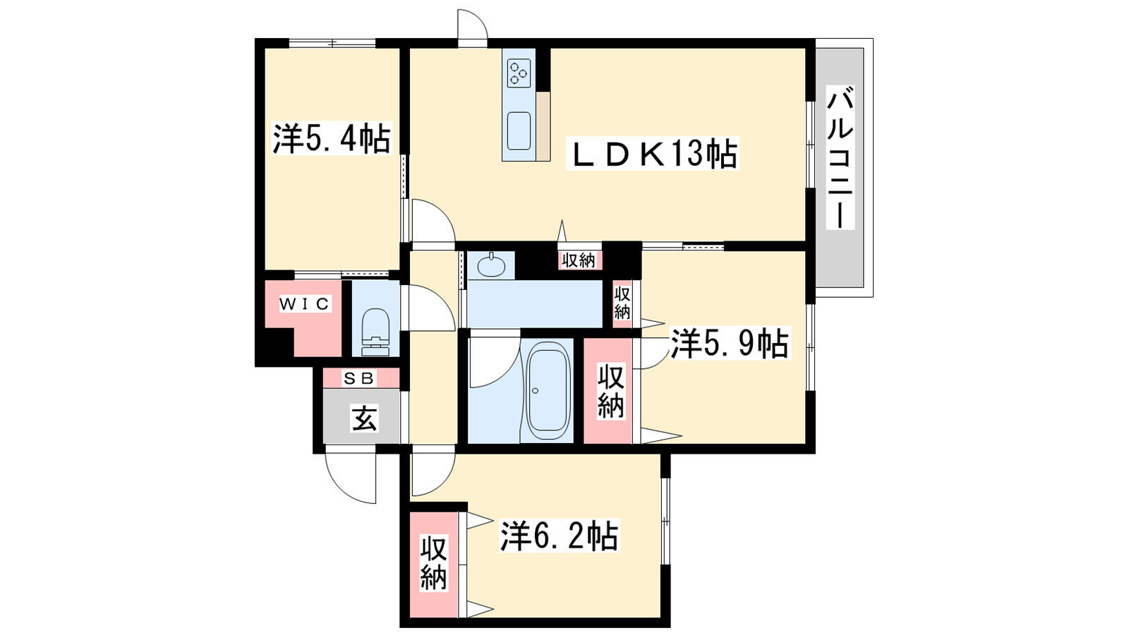 - LDK13帖、洋室6.2帖、洋室5.9帖、洋室5.4帖