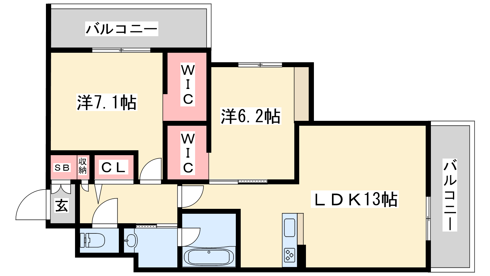 - LDK13帖、洋室7.1帖、洋室6.2帖