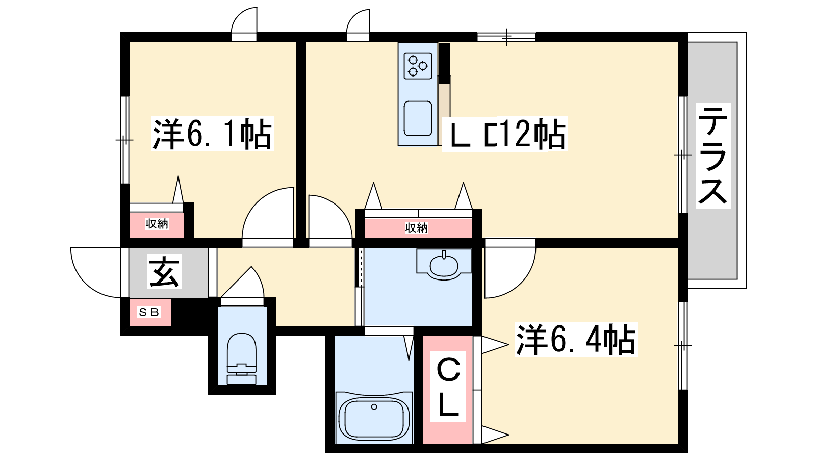 - LDK12帖、洋室6.4帖、洋室6.1帖