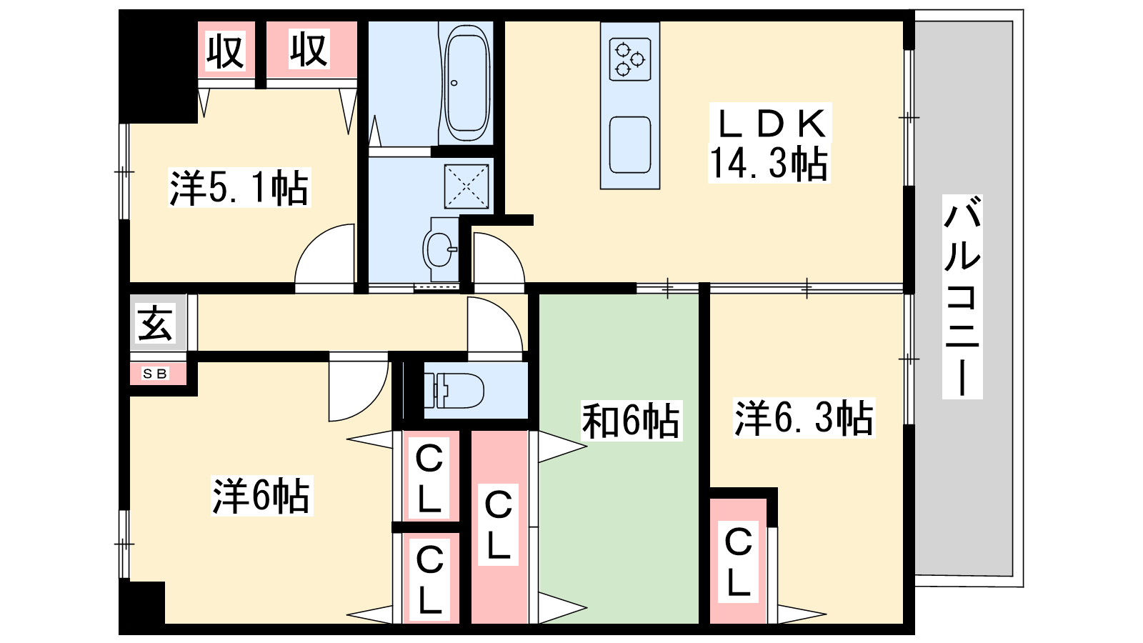- LDK14.3帖、洋室6.3帖、洋室6帖、和室6帖、洋室5.1帖