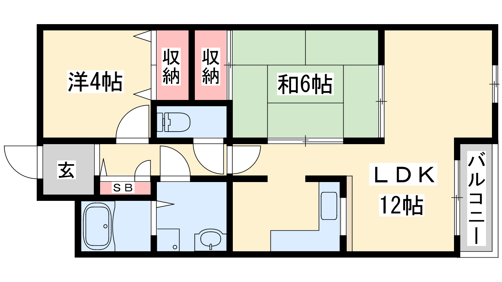 - LDK12帖、洋室4帖、和室6帖