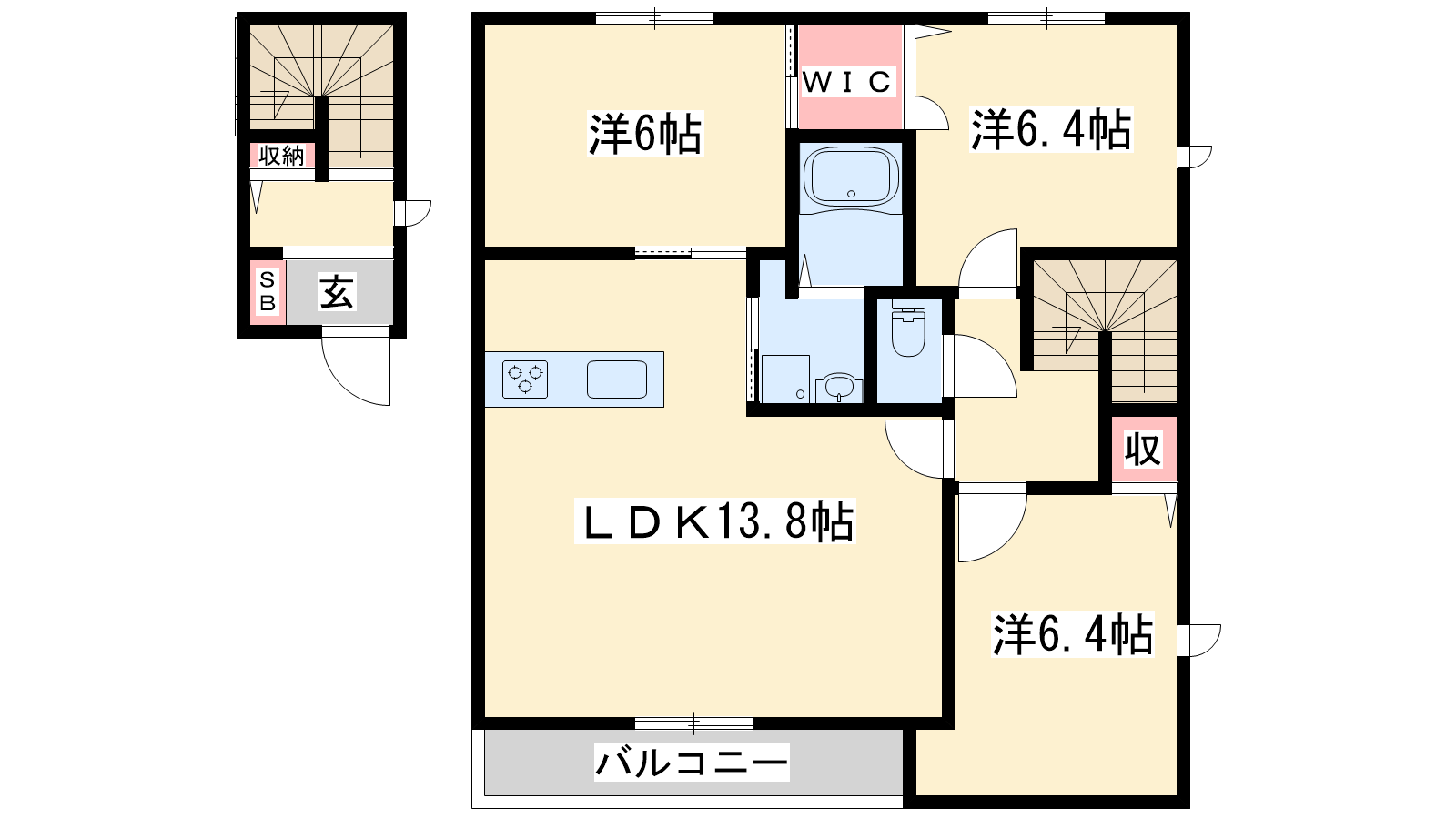 - LDK13.8帖、洋室6.4帖、洋室6.4帖、洋室6帖