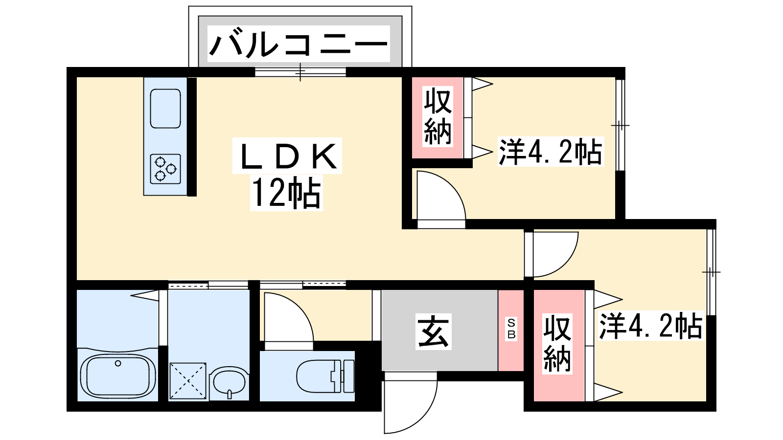 - LDK12帖、洋室4.2帖、洋室4.2帖