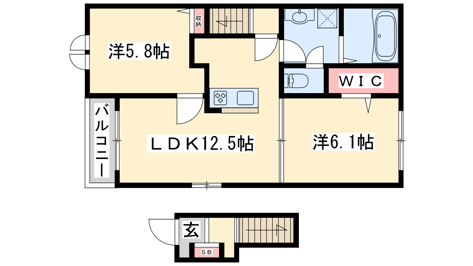 - LDK12.5帖、洋室6.1帖、洋室5.8帖