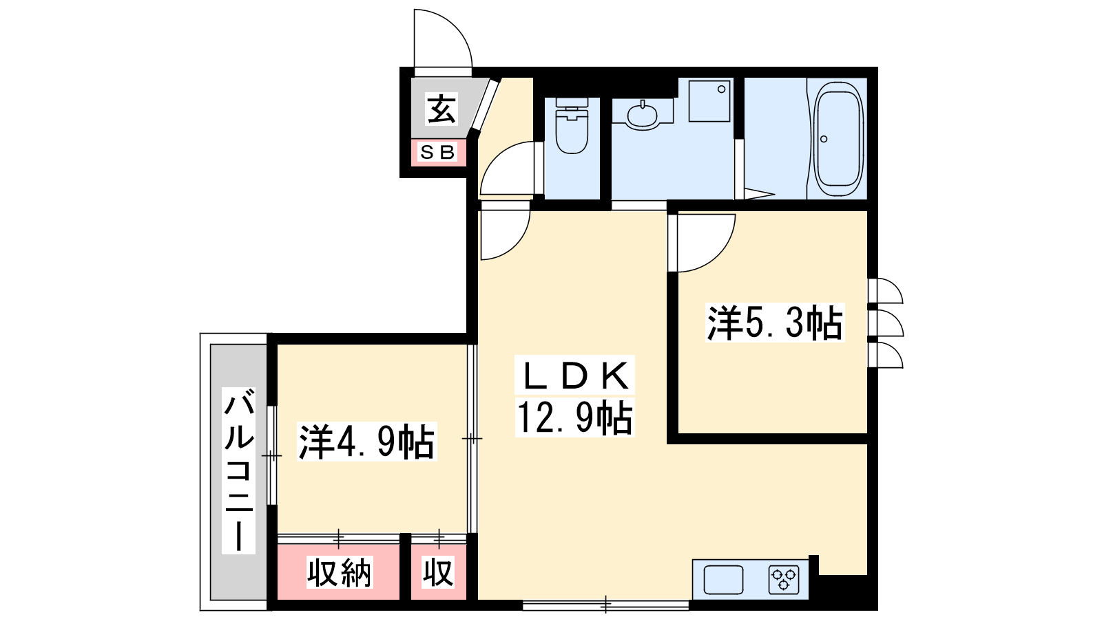 - LDK12.9帖、洋室5.3帖、洋室4.9帖