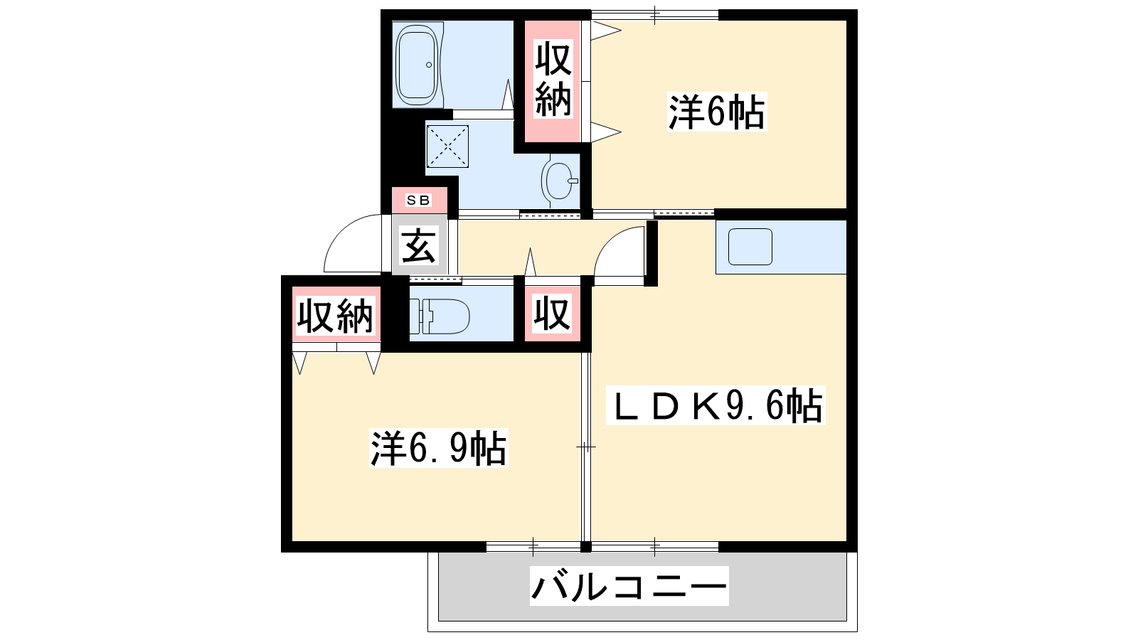 - LDK9.6帖、洋室6.9帖、洋室6帖
