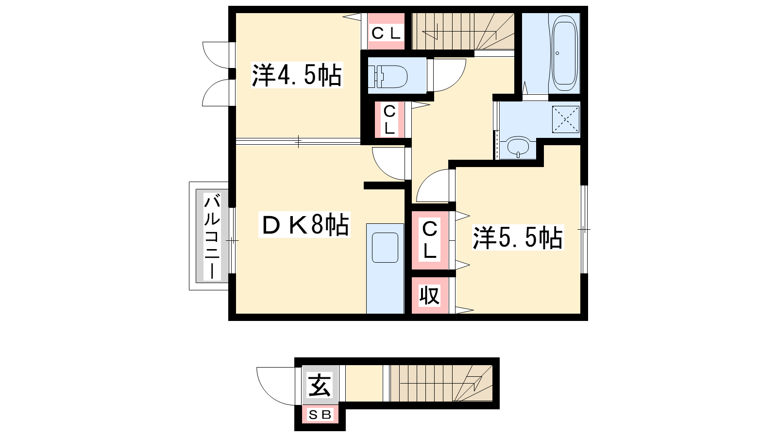 - DK8帖、洋室5.5帖、洋室4.5帖