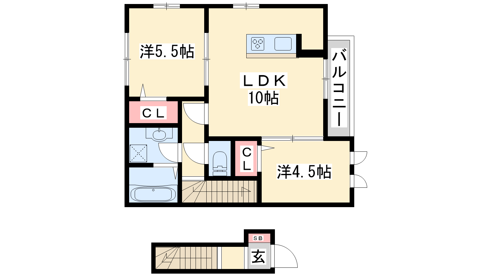 - LDK10帖、洋室5.5帖、洋室4.5帖