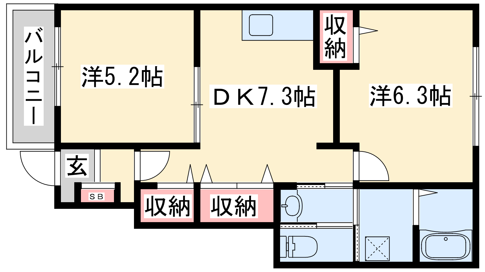 - DK7.3帖、洋室6.3帖、洋室5.2帖