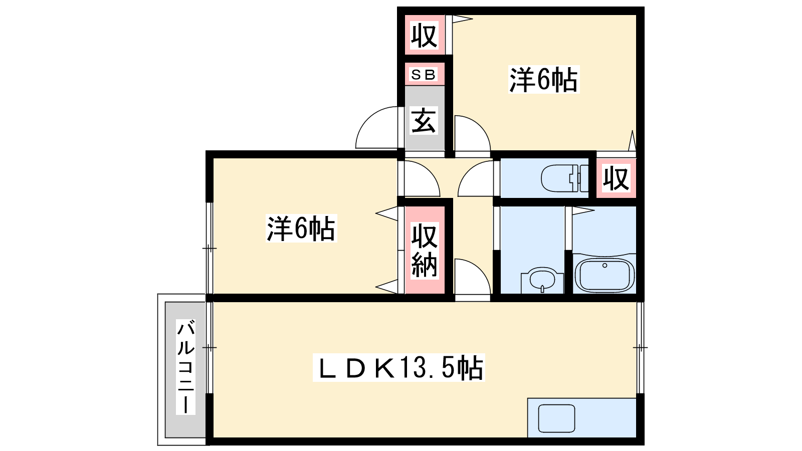 - LDK13.5帖、洋室6帖、洋室6帖