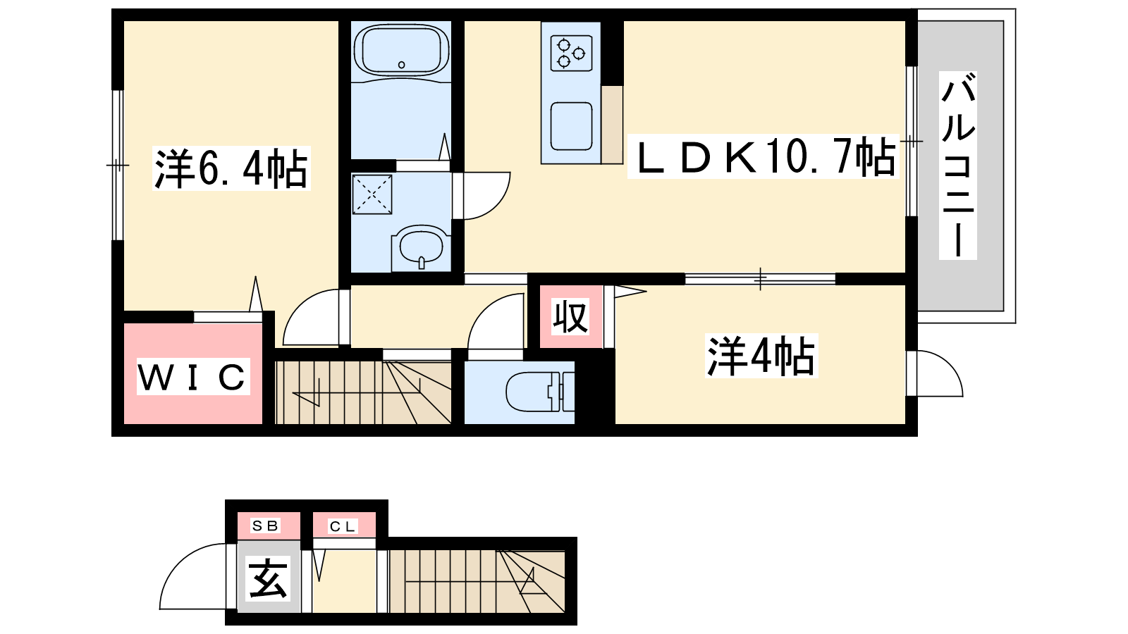 - LDK10.7帖、洋室6.4帖、洋室4帖