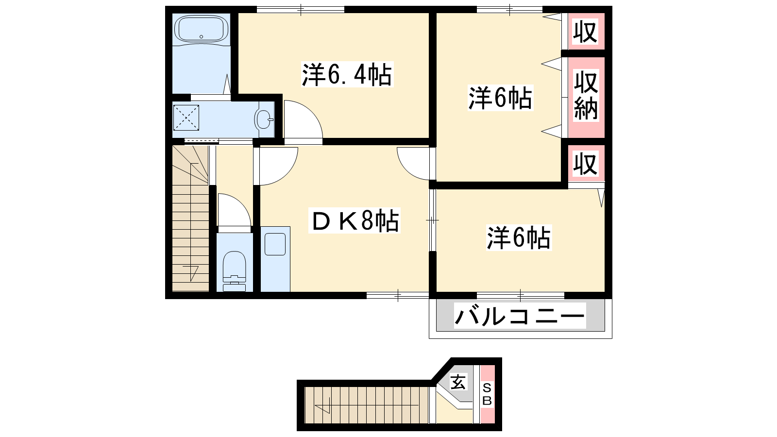 - DK8帖、洋室6.4帖、洋室6帖、洋室6帖