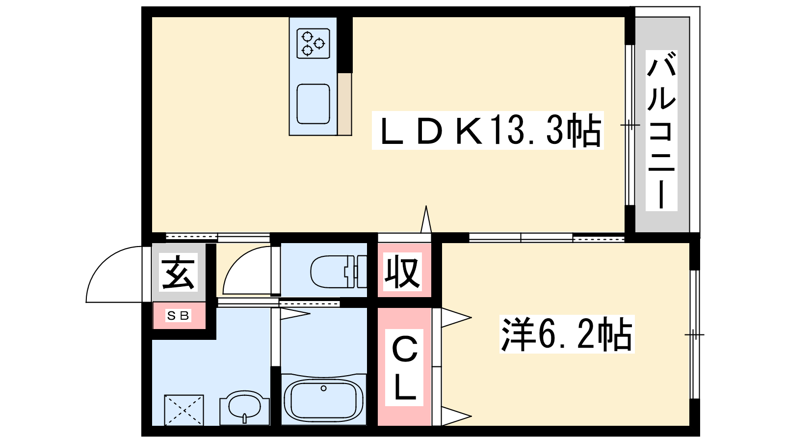 - LDK13.3帖、洋室6.2帖