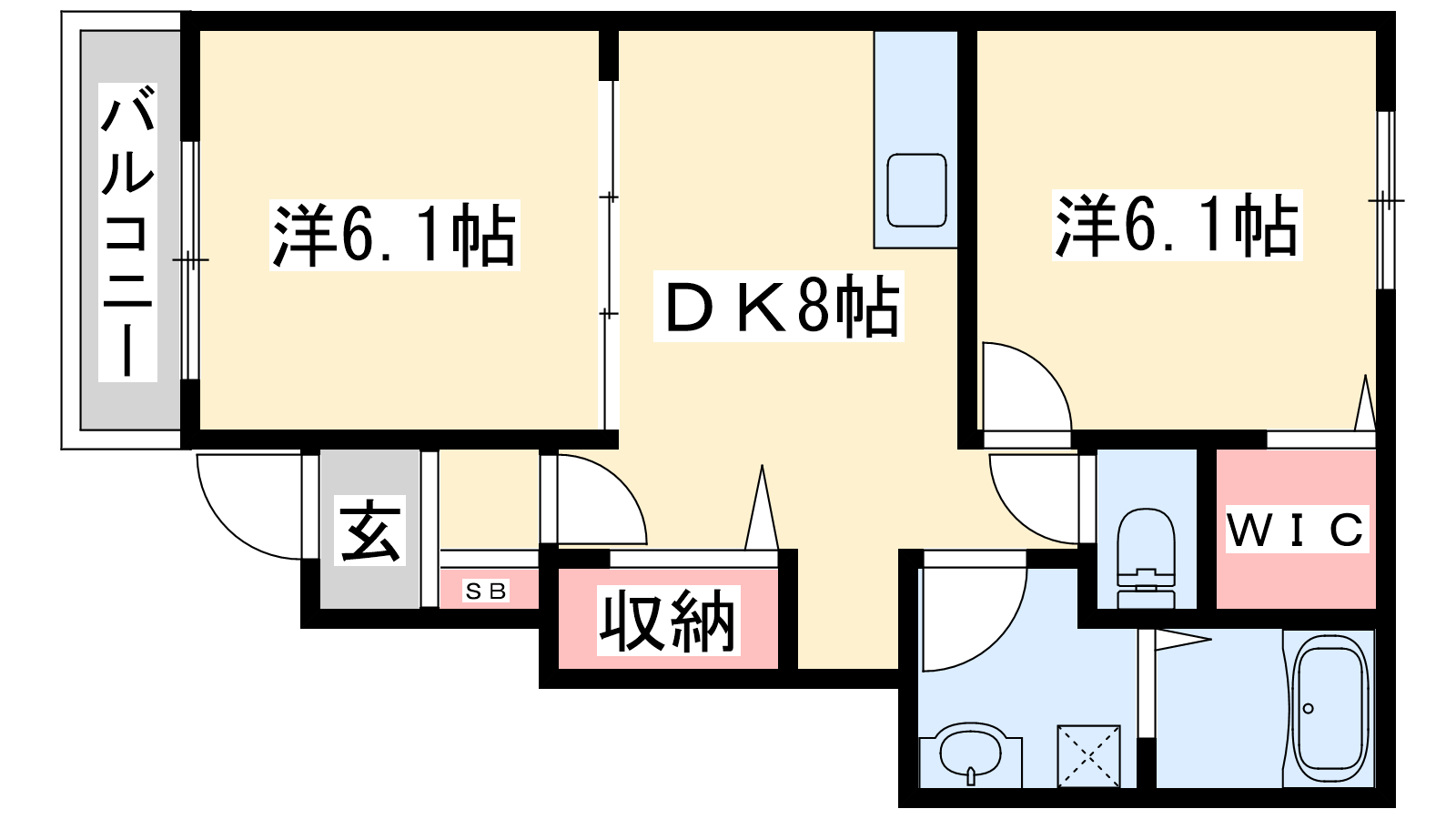 - DK8帖、洋室6.1帖、洋室6.1帖