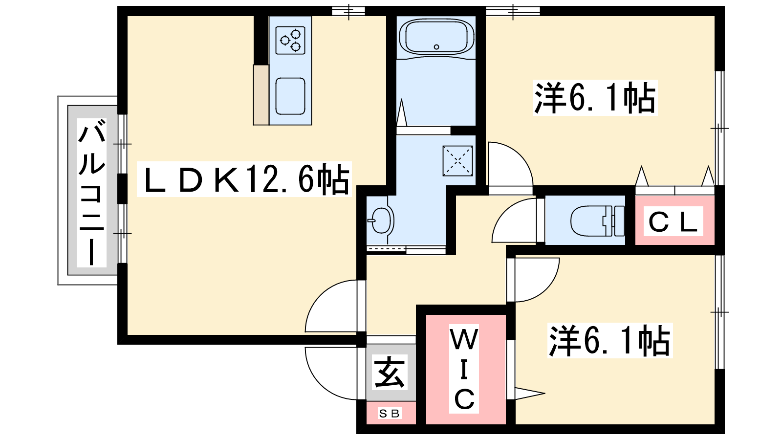 - LDK12.6帖、洋室6.1帖、洋室6.1帖