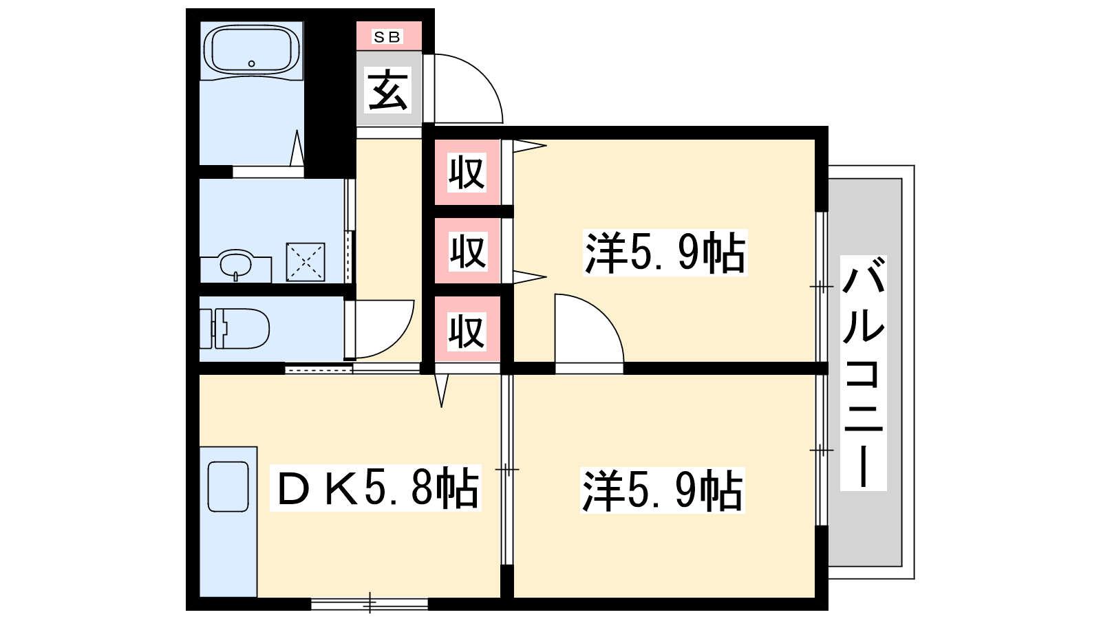 - DK5.8帖、洋室5.9帖、洋室5.9帖