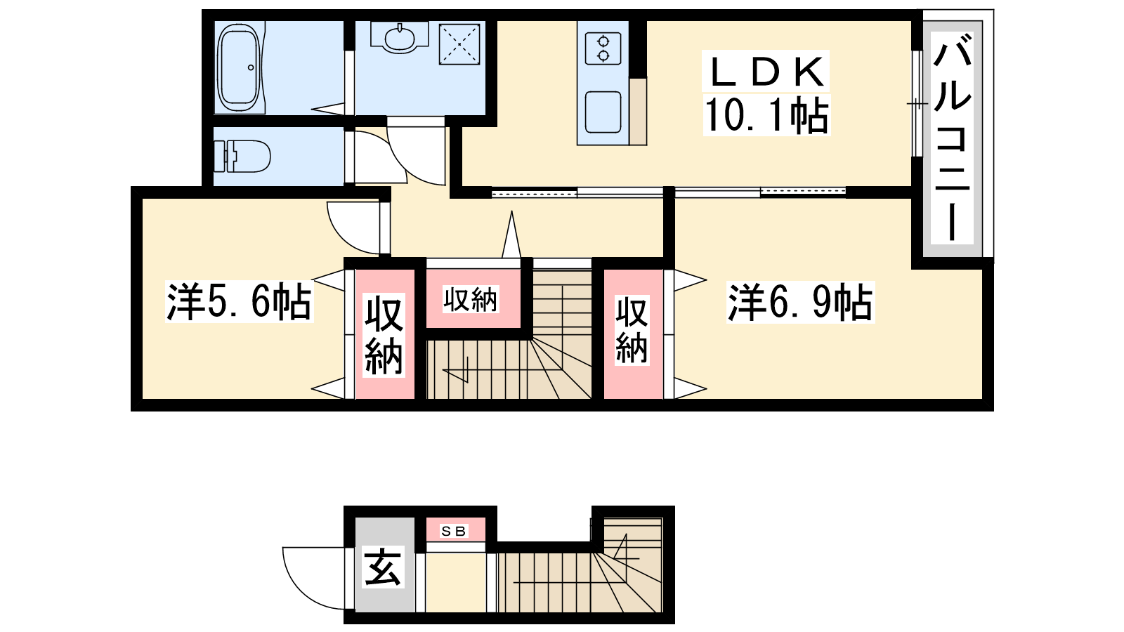 - LDK10.1帖、洋室6.9帖、洋室5.6帖
