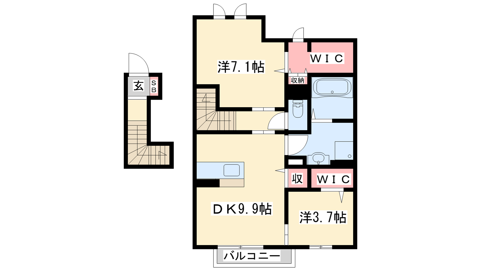 - LDK9.9帖、洋室7.1帖、洋室3.8帖