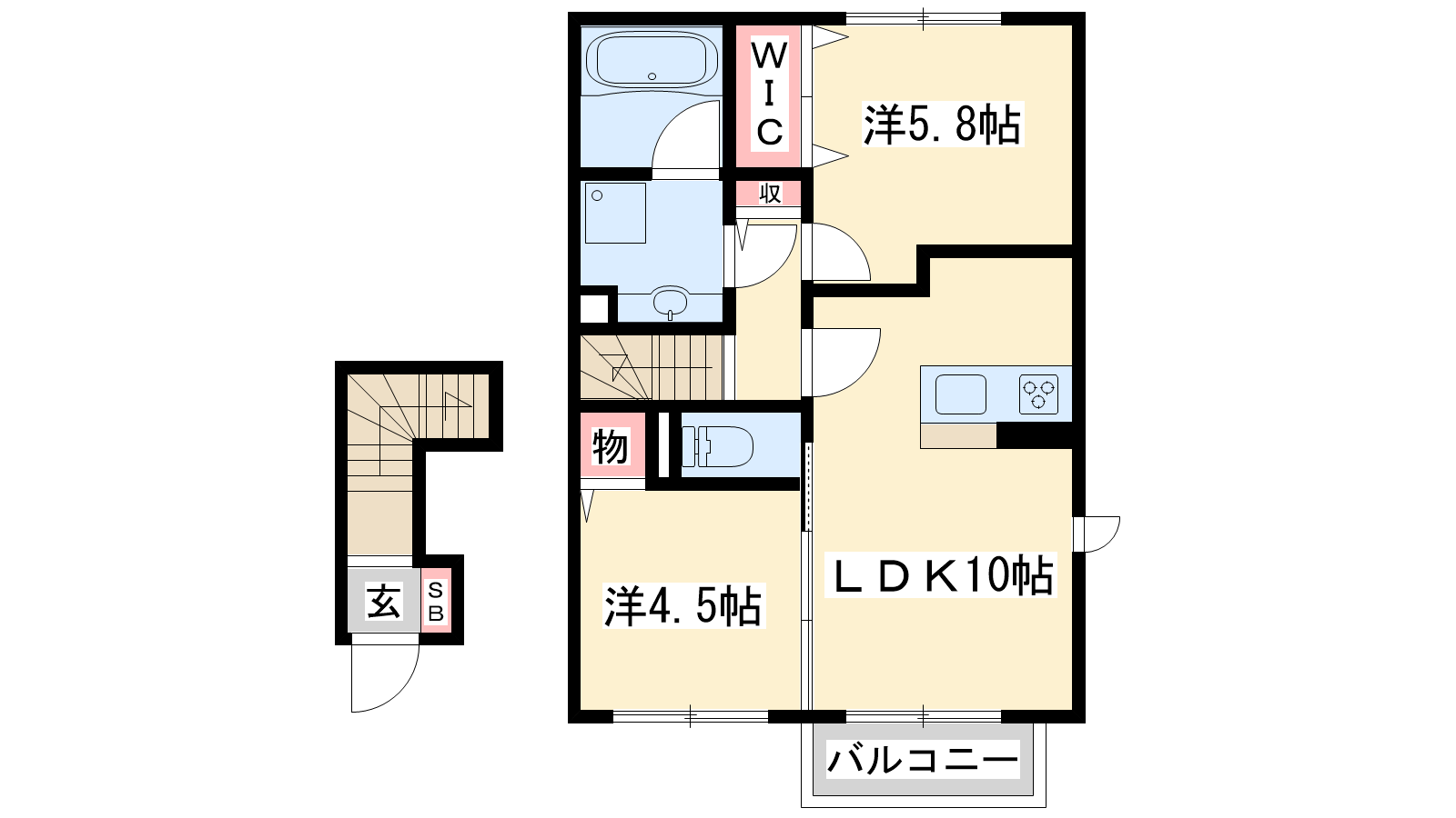 - LDK10帖、洋室5.8帖、洋室4.5帖