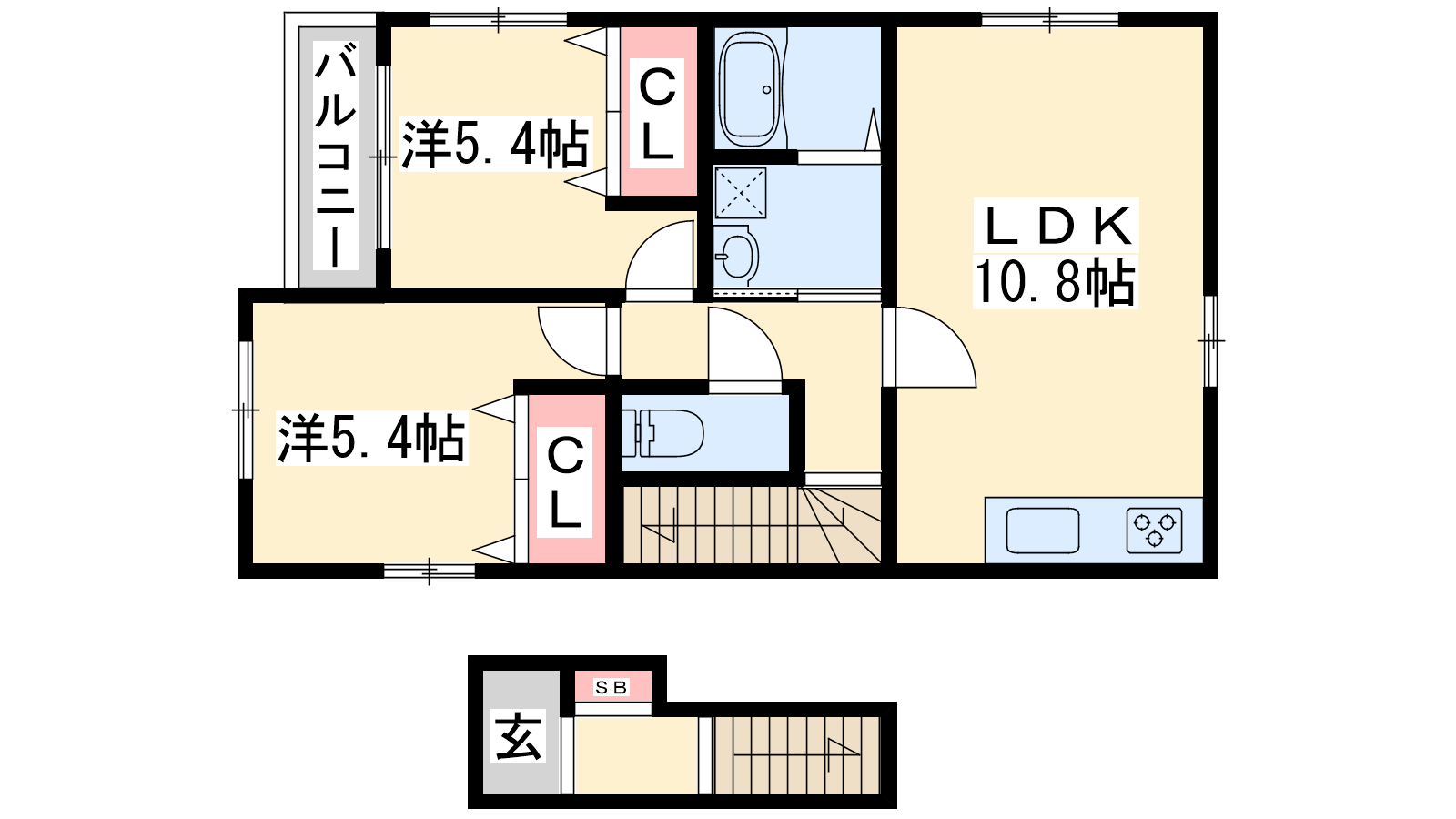 - LDK10.8帖、洋室5.4帖、洋室5.4帖