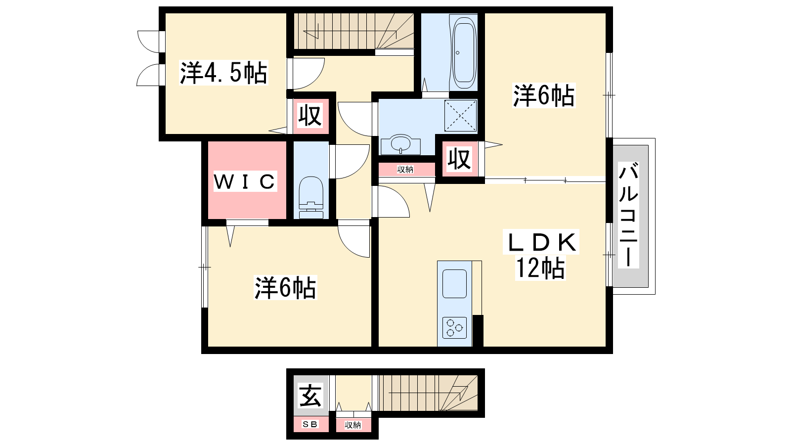 - LDK12帖、洋室6帖、洋室6帖、洋室4.5帖