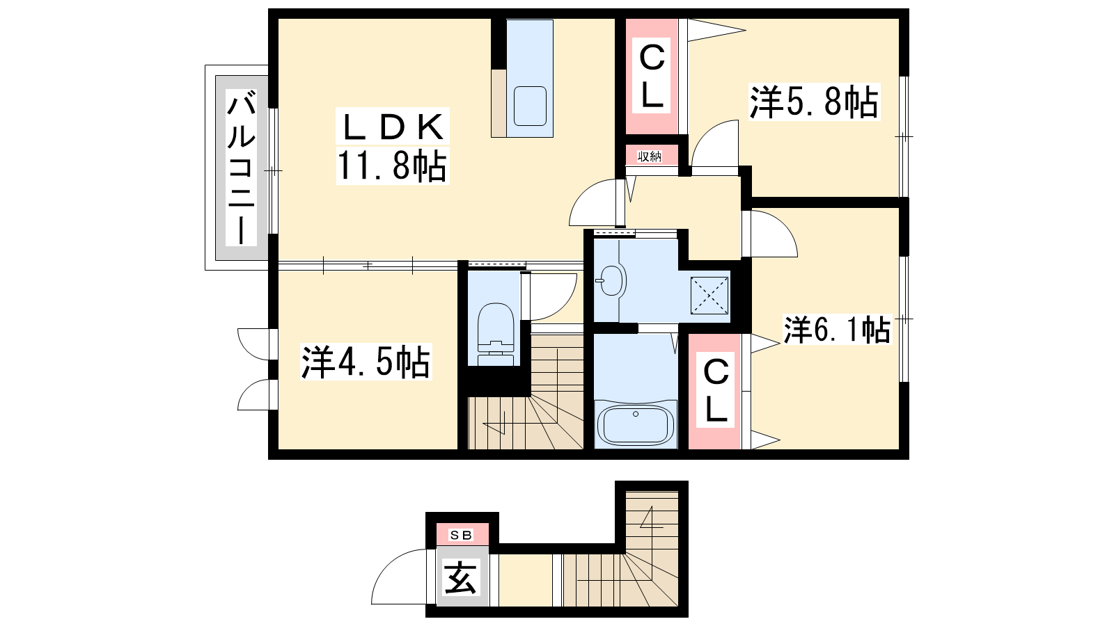 - LDK11.8帖、洋室6.1帖、洋室5.8帖、洋室4.5帖