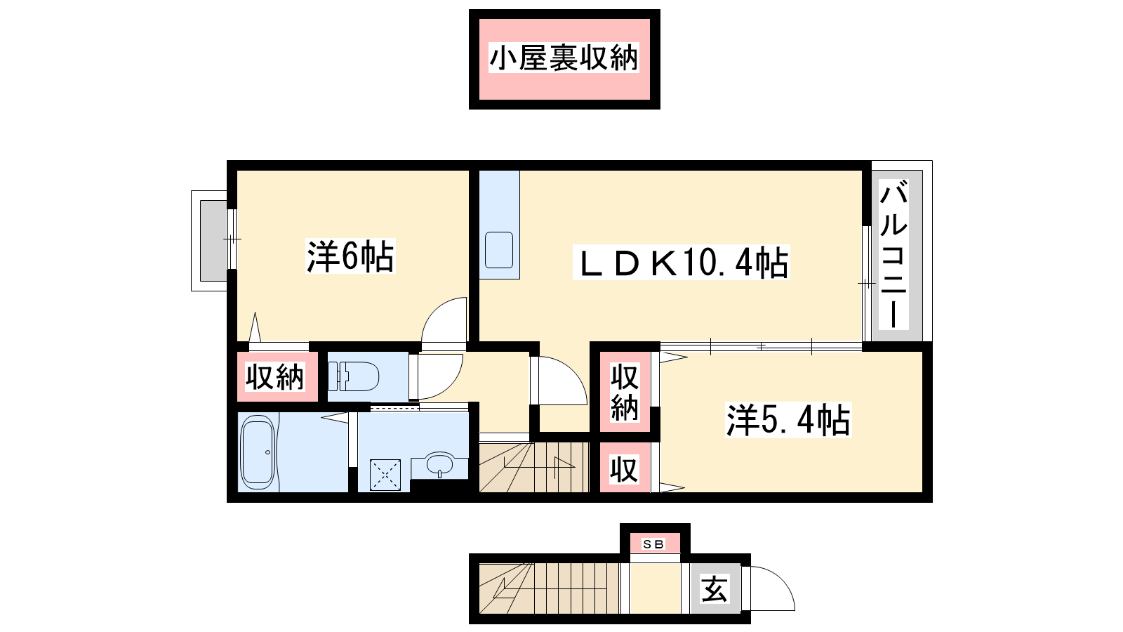 - LDK10.4帖、洋室6帖、洋室5.4帖