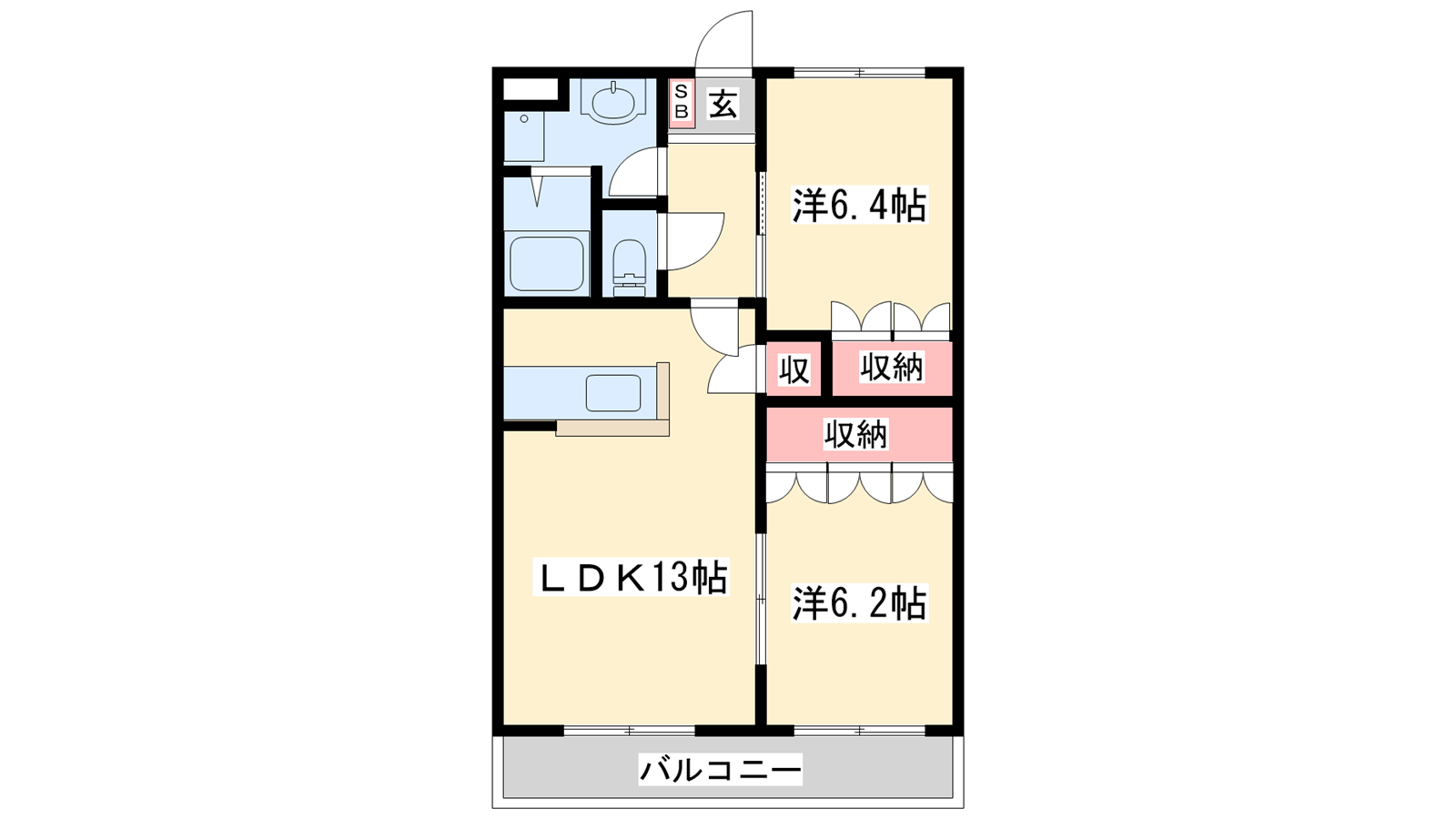 - LDK13帖、洋室6.4帖、洋室6.2帖