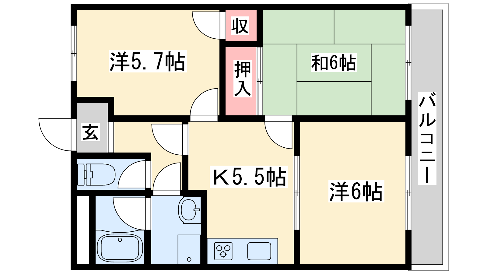 - K5.5帖、洋室6帖、洋室5.7帖、和室6帖