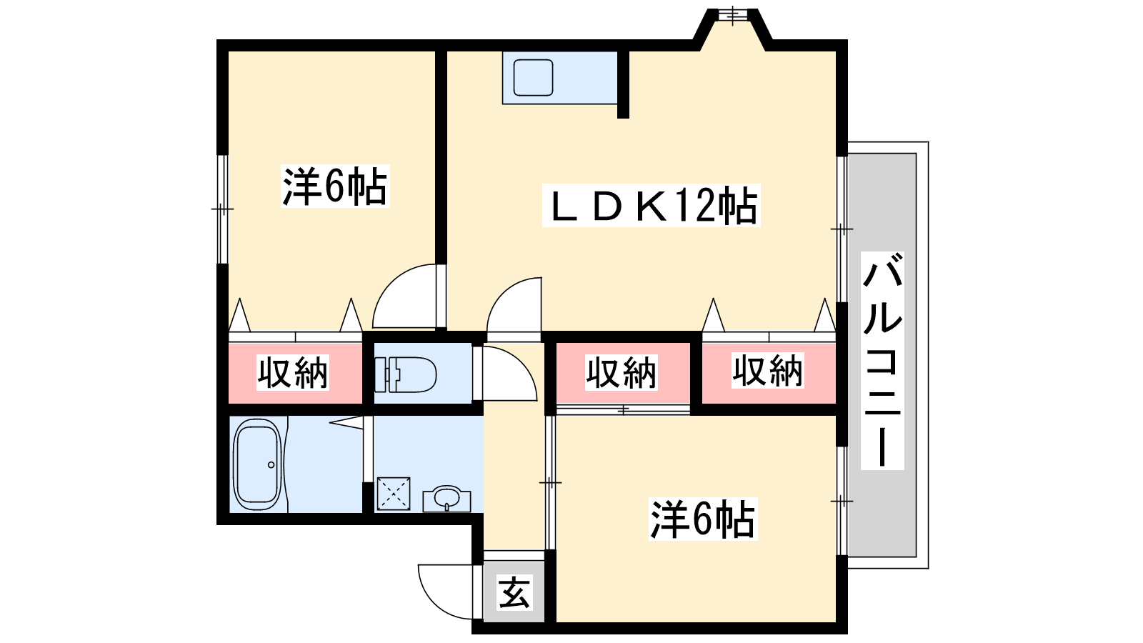 - LDK12帖、洋室6帖、洋室6帖