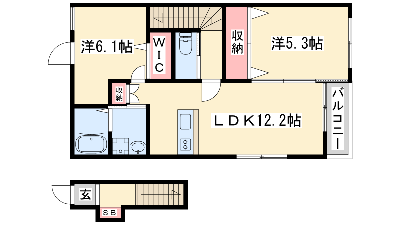 - LDK12.2帖、洋室6.1帖、洋室5.3帖