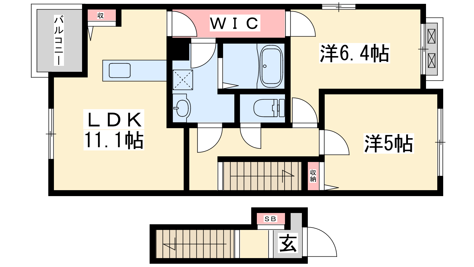 - LDK11.1帖、洋室6.4帖、洋室5帖