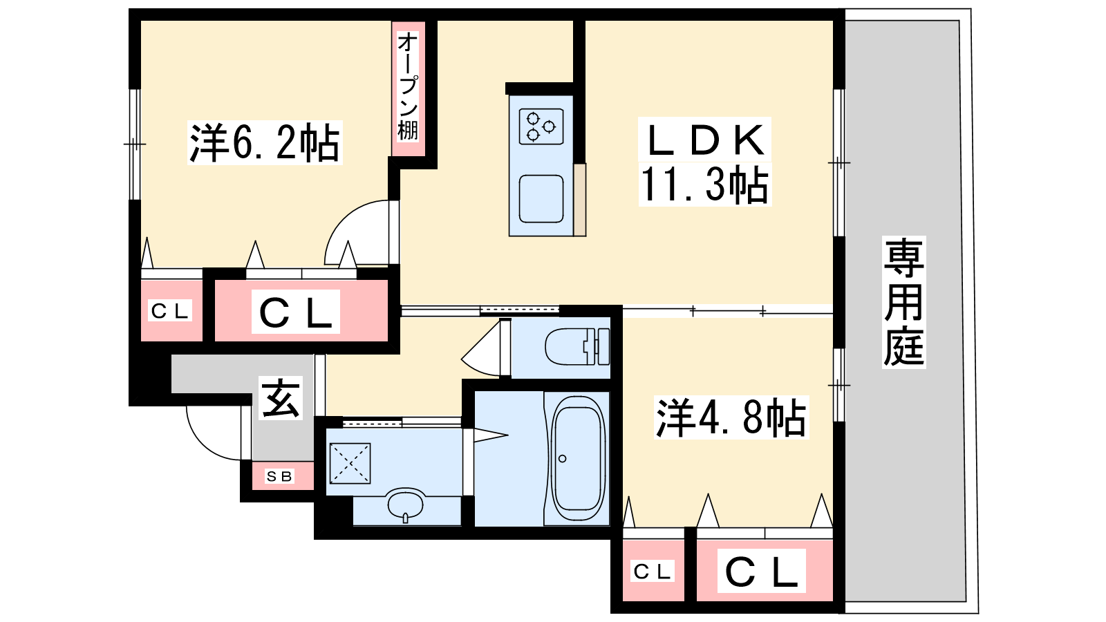 - LDK11.3帖、洋室6.2帖、洋室4.8帖