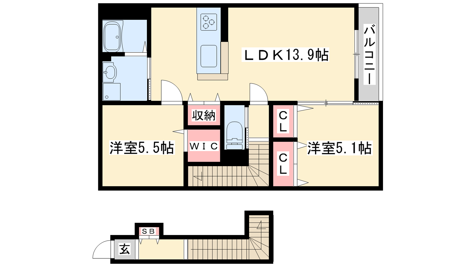 - LDK13.9帖、洋室5.5帖、洋室5.1帖