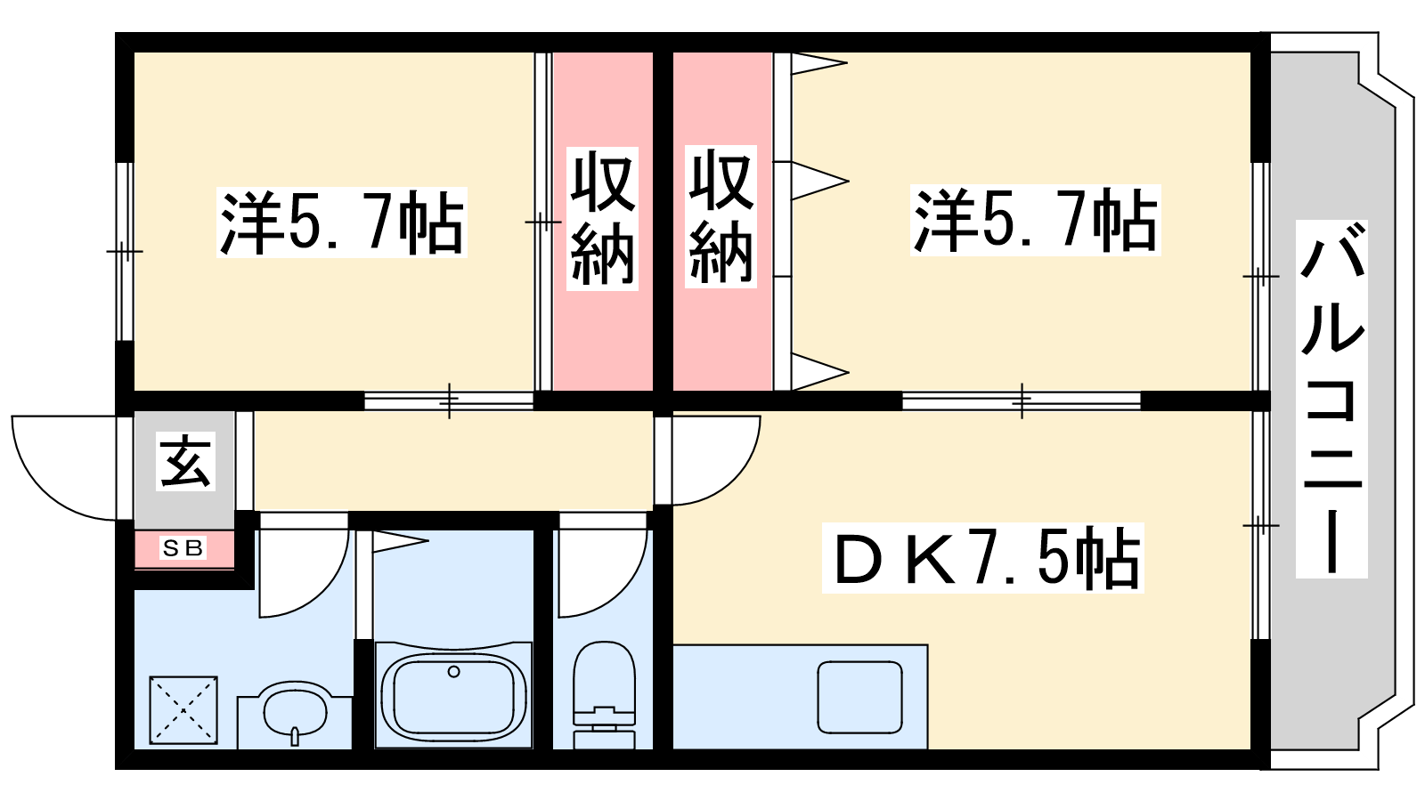 - DK7.5帖、洋室5.7帖、洋室5.7帖