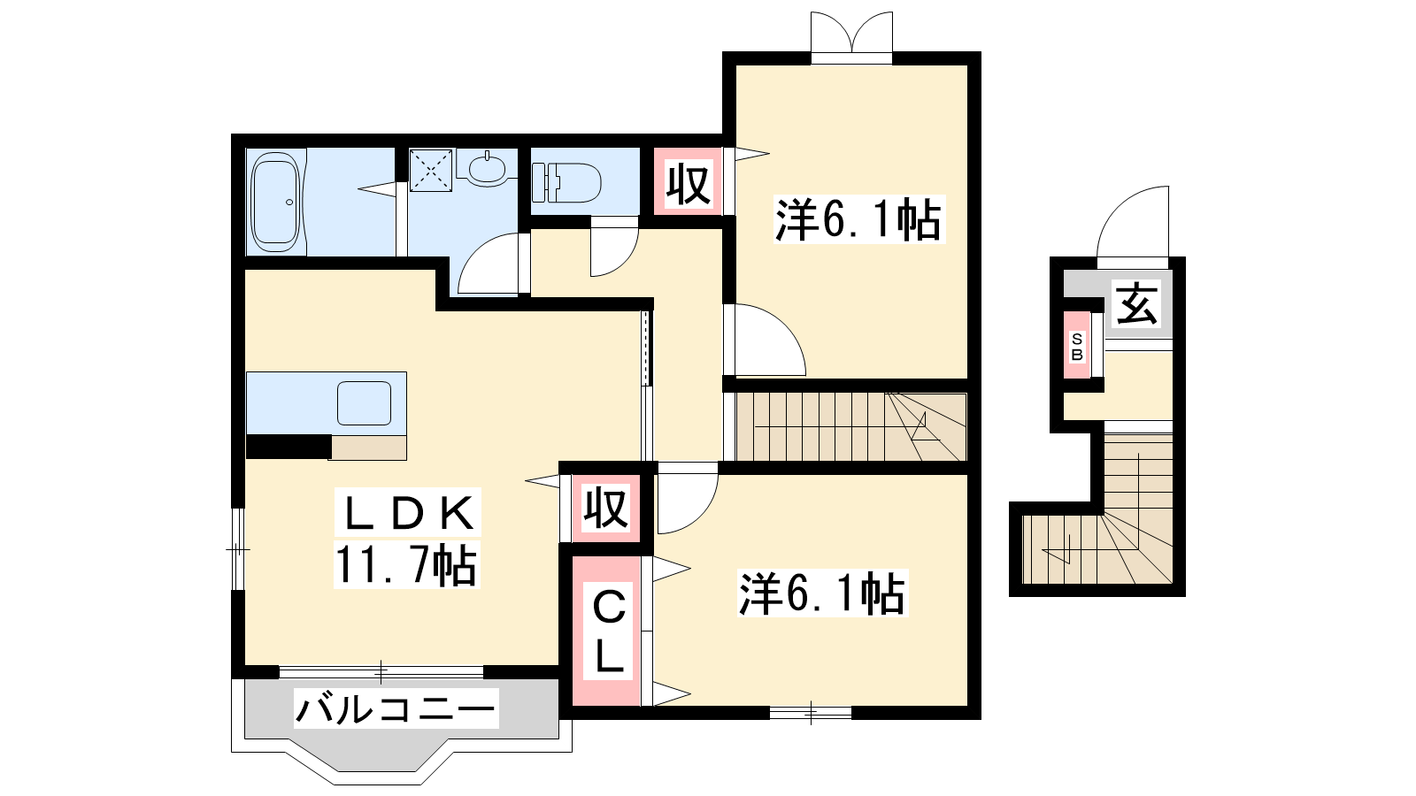 - LDK11.7帖、洋室6.1帖、洋室6.1帖